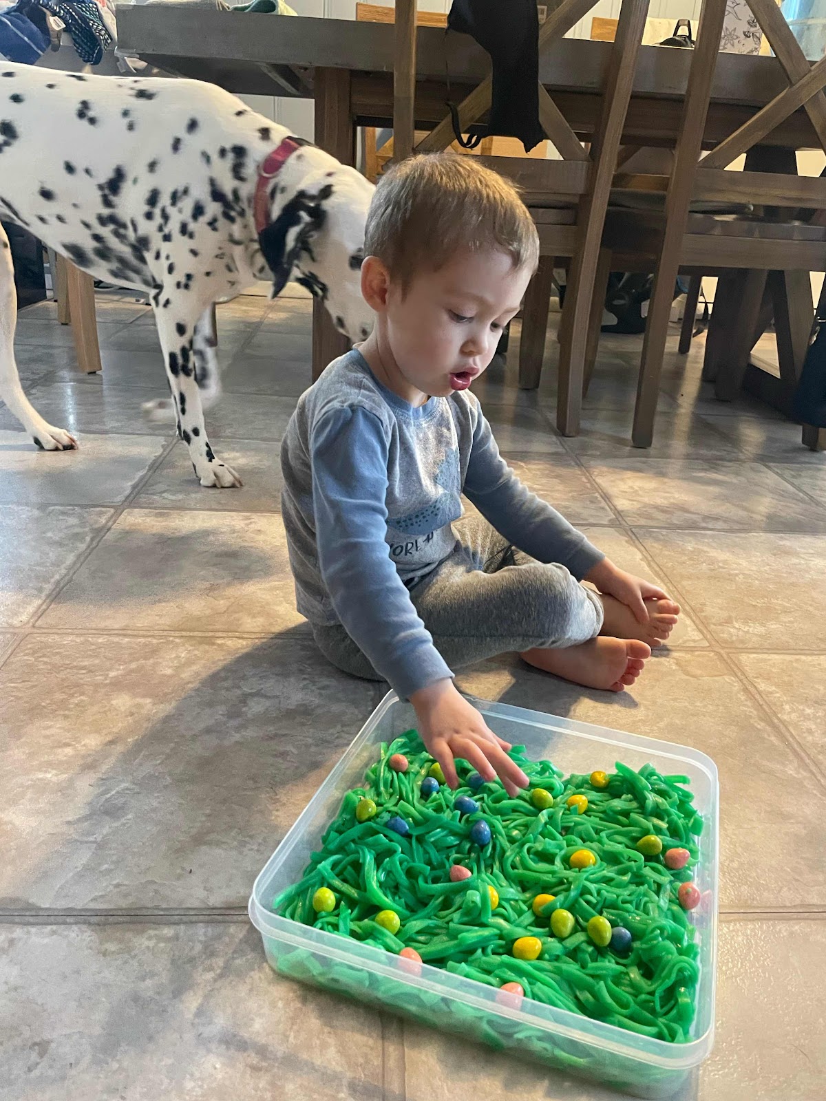 Quinn thought that egg was pretty cool so I made him some “grass”—spaghetti dyed green—and put some Reese eggs in it to play with/eat.