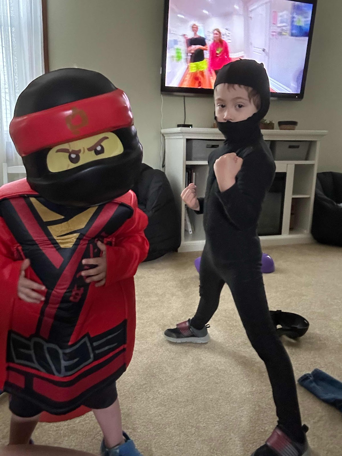 Our old neighbors and friends, Ryan and Lill and their boys, stopped to see us, too. Lill brought a bag of costumes for our boys that she had been given. They were super stoked about it 😆. Quinn is glad Ash has a ninja costume, too.